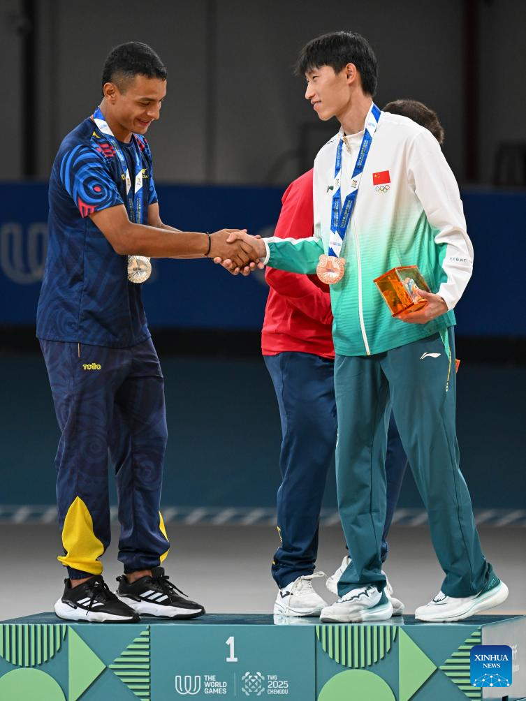 CHENGDU, 14 agosto, 2025 (Xinhua) -- El medallista de de bronce Zhang Zhenhai (d), de China, saluda al medallista de plata Jhon Edwar Tascón Holguín, de Colombia, durante la ceremonia de premiación de esprint masculino 500 m +D de patinaje de velocidad en línea en pista en los Juegos Mundiales 2025, en Chengdu, en la provincia de Sichuan, en el suroeste de China, el 14 de agosto de 2025. (Xinhua/Xie Jianfei)