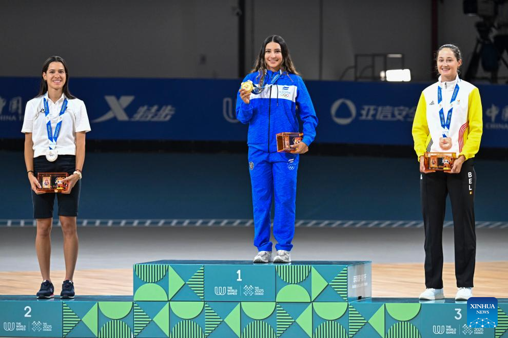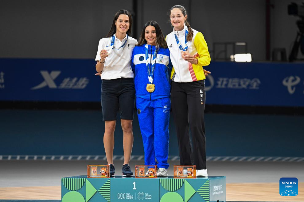CHENGDU, 14 agosto, 2025 (Xinhua) -- La medallista de oro, Ivonne Saraí Nóchez Gallardo (c), de El Salvador, la medallista de plata, Haila Brunet Alvarez (i), de Francia, y la medallista de bronce, Fran Vanhoutte, de Bélgica, posan durante la ceremonia de premiación de los 200 m contrarreloj dual femenino de patinaje de velocidad en línea en pista en los Juegos Mundiales 2025, en Chengdu, en la provincia de Sichuan, en el suroeste de China, el 14 de agosto de 2025. (Xinhua/Xie Jianfei)