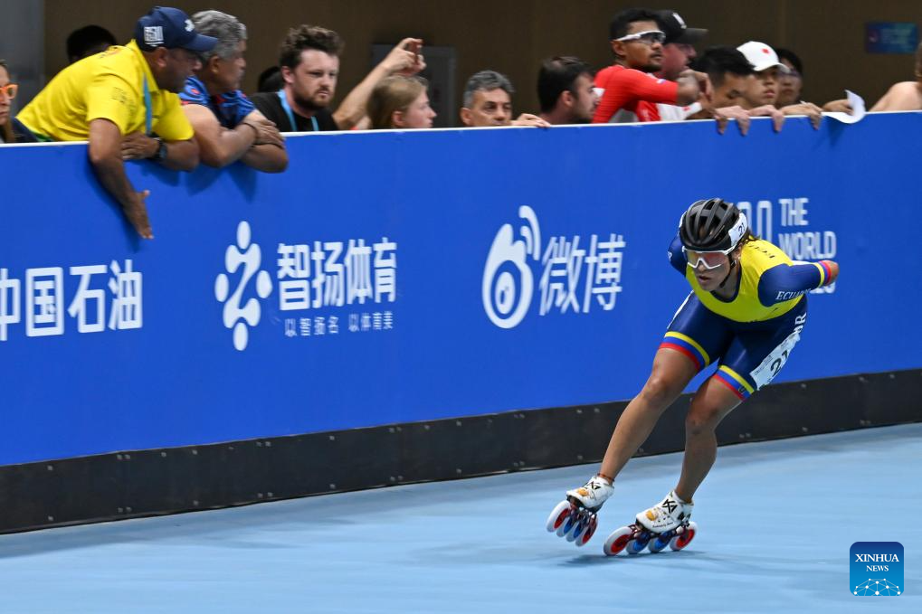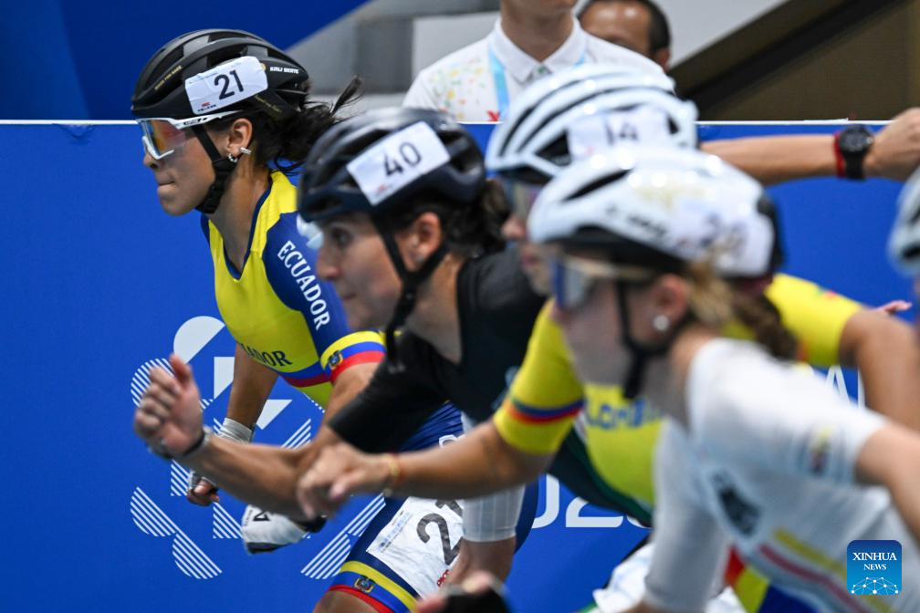 CHENGDU, 14 agosto, 2025 (Xinhua) -- Gabriela Vargas Sarmiento, de Ecuador, compite durante la final de la carrera de 5000 m por puntos femenina de patinaje de velocidad en línea en pista, en los Juegos Mundiales 2025, en Chengdu, en la provincia de Sichuan, en el suroeste de China, el 14 de agosto de 2025. (Xinhua/Xie Jianfei)
