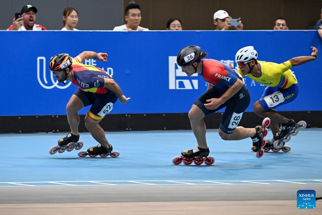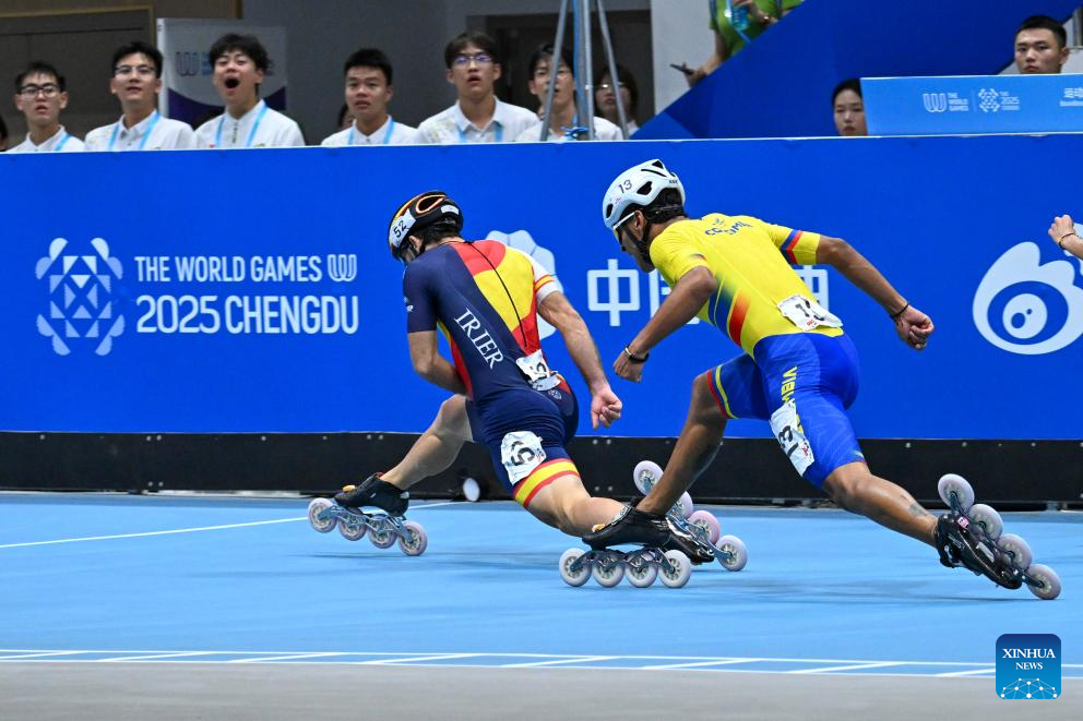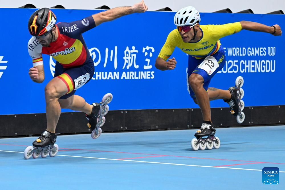 CHENGDU, 14 agosto, 2025 (Xinhua) -- Jhoan Sebastián Guzmán Bitar (i), de España, y Jhon Edwar Tascón Holguín (d), de Colombia, compiten durante la final A de esprint masculino 500 m +D de patinaje de velocidad en línea en pista en los Juegos Mundiales 2025, en Chengdu, en la provincia de Sichuan, en el suroeste de China, el 14 de agosto de 2025. (Xinhua/Xie Jianfei)