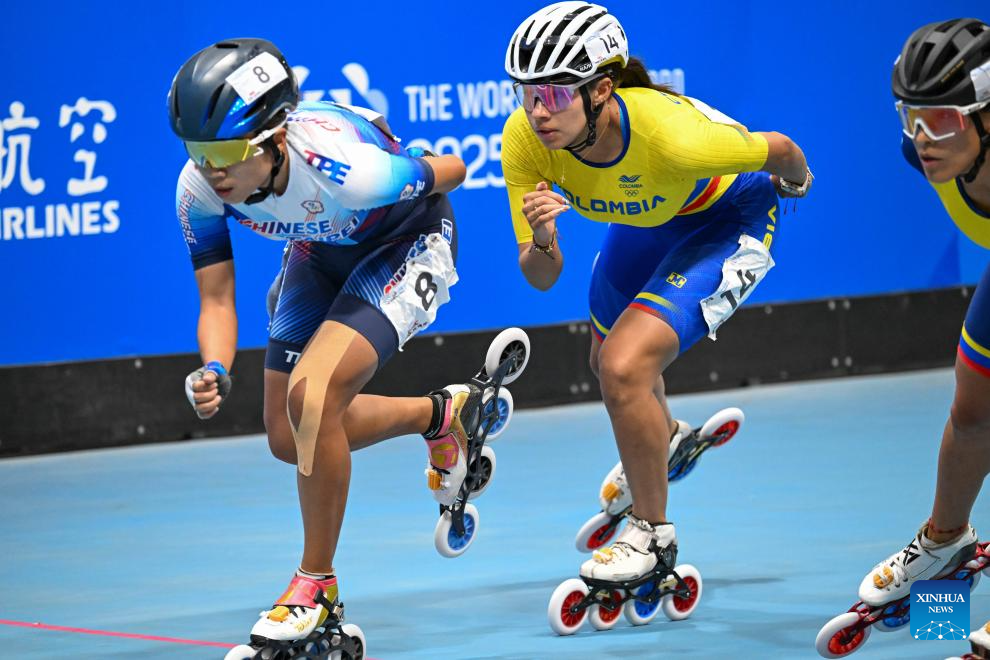 CHENGDU, 14 agosto, 2025 (Xinhua) -- Gabriela Rueda (c), de Colombia, compite durante la final de la carrera de 5000 m por puntos femenina de patinaje de velocidad en línea en pista, en los Juegos Mundiales 2025, en Chengdu, en la provincia de Sichuan, en el suroeste de China, el 14 de agosto de 2025. (Xinhua/Xie Jianfei)