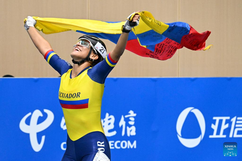 CHENGDU, 14 agosto, 2025 (Xinhua) -- Gabriela Vargas Sarmiento, de Ecuador, festeja al término de la final de la carrera de 5000 m por puntos femenina de patinaje de velocidad en línea en pista, en los Juegos Mundiales 2025, en Chengdu, en la provincia de Sichuan, en el suroeste de China, el 14 de agosto de 2025. (Xinhua/Xie Jianfei)