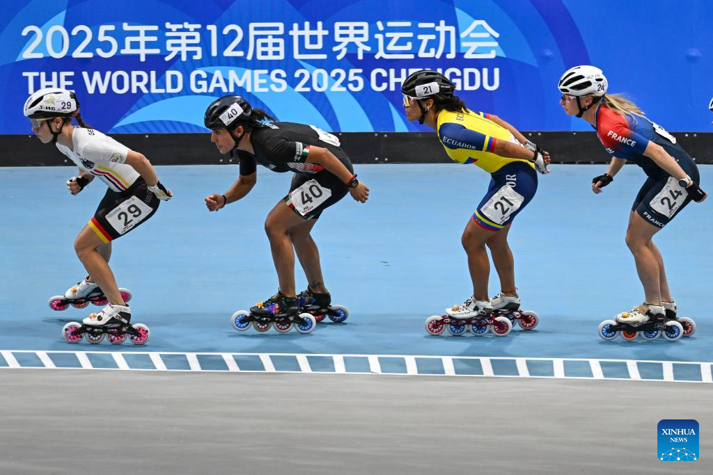 CHENGDU, 14 agosto, 2025 (Xinhua) -- Gabriela Vargas Sarmiento (2-d), de Ecuador, compite durante la final de la carrera de 5000 m por puntos femenina de patinaje de velocidad en línea en pista, en los Juegos Mundiales 2025, en Chengdu, en la provincia de Sichuan, en el suroeste de China, el 14 de agosto de 2025. (Xinhua/Xie Jianfei)