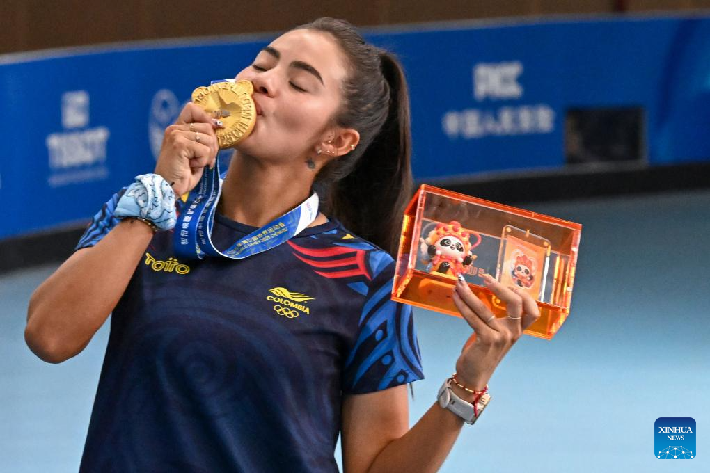 CHENGDU, 14 agosto, 2025 (Xinhua) -- Gabriela Rueda, de Colombia, besa su medalla al término de la ceremonia de premiación de la carrera de 5000 m por puntos femenina de patinaje de velocidad en línea en pista, en los Juegos Mundiales 2025, en Chengdu, en la provincia de Sichuan, en el suroeste de China, el 14 de agosto de 2025. (Xinhua/Xie Jianfei)