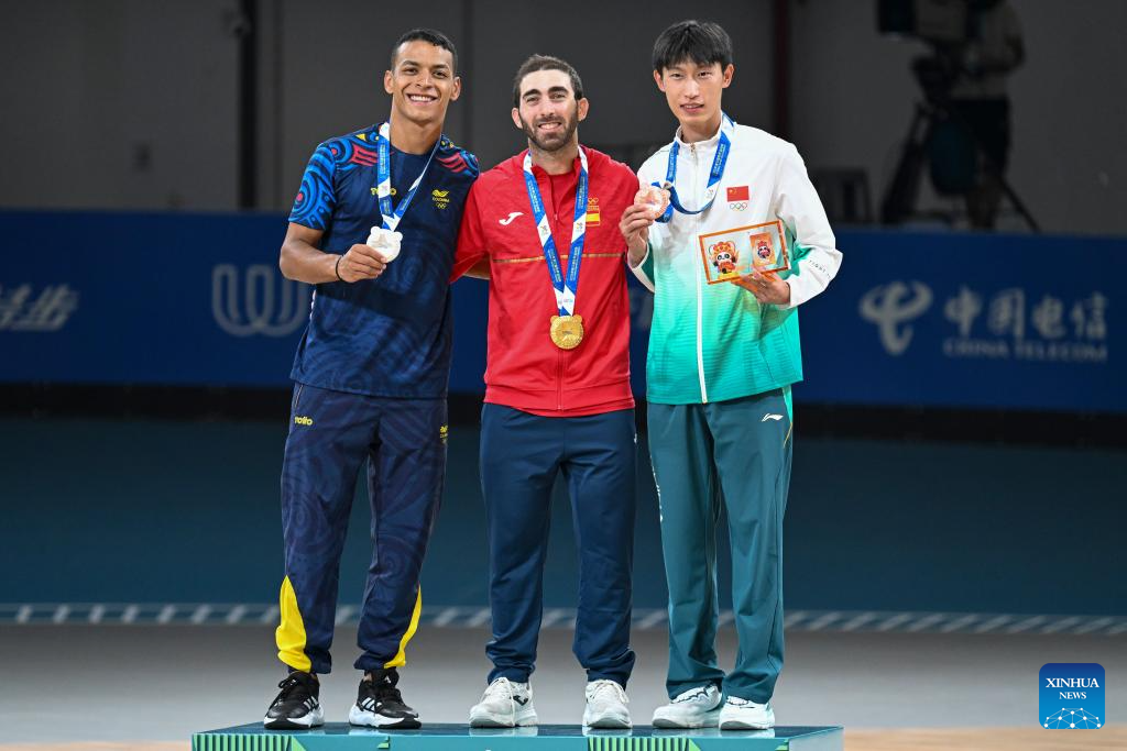 CHENGDU, 14 agosto, 2025 (Xinhua) -- El medallista de oro Jhoan Sebastián Guzmán Bitar (c), de España, el medallista de plata Jhon Edwar Tascón Holguín (i), de Colombia, y el medallista de bronce Zhang Zhenhai, de China, posan durante la ceremonia de premiación de esprint masculino 500 m +D de patinaje de velocidad en línea en pista en los Juegos Mundiales 2025, en Chengdu, en la provincia de Sichuan, en el suroeste de China, el 14 de agosto de 2025. (Xinhua/Xie Jianfei)
