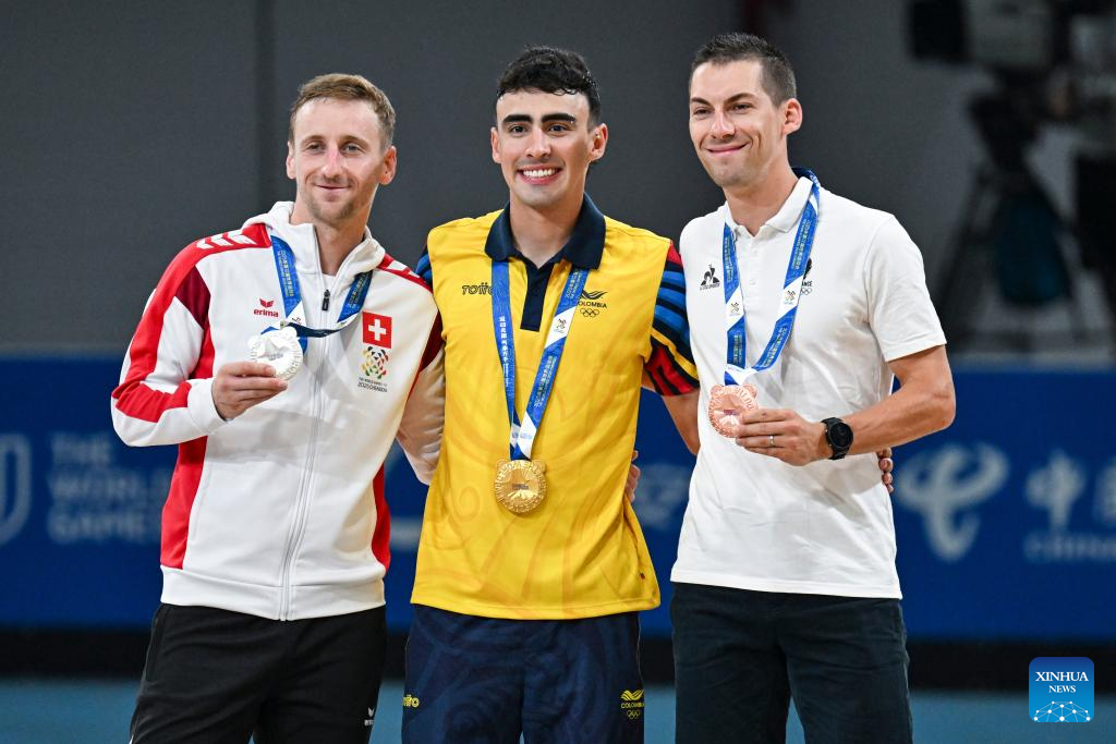 CHENGDU, 15 agosto, 2025 (Xinhua) -- El medallista de oro Juan Jacobo Mantilla Pinilla (c), de Colombia, el medallista de plata, Livio Wenger (i), de Suiza, y el medallista de bronce Martin Ferrie, de Francia, posan durante la ceremonia de premiación de la final de la carrera de eliminación masculina de 10000 m de patinaje de velocidad en línea en pista en los Juegos Mundiales 2025, en Chengdu, en la provincia de Sichuan, en el suroeste de China, el 15 de agosto de 2025. (Xinhua/Xie Jianfei)