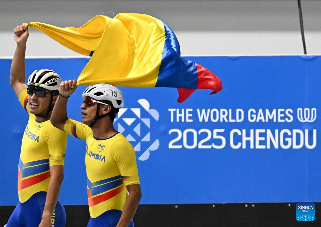 CHENGDU, 15 agosto, 2025 (Xinhua) -- Jhon Edwar Tascón Holguín (d), de Colombia, que finalizó en segundo lugar, festeja con su compañero de equipo Juan Jacobo Mantilla Pinilla, quien posteriormente fue descalificado, al término de la final de esprint masculino 1000 m de patinaje de velocidad en línea en pista en los Juegos Mundiales 2025, en Chengdu, en la provincia de Sichuan, en el suroeste de China, el 15 de agosto de 2025. (Xinhua/Xie Jianfei)