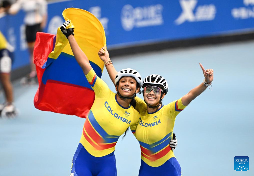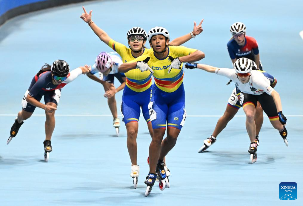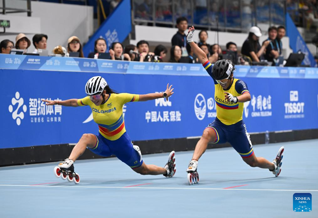 CHENGDU, 15 agosto, 2025 (Xinhua) -- Gabriela Rueda (i), de Colombia, y Gabriela Vargas Sarmiento, de Ecuador, cruzan la línea de meta al término de la final de la carrera de eliminación femenina de 10000 m de patinaje de velocidad en línea en pista, en los Juegos Mundiales 2025, en Chengdu, en la provincia de Sichuan, en el suroeste de China, el 15 de agosto de 2025. (Xinhua/Zhang Bowen)
