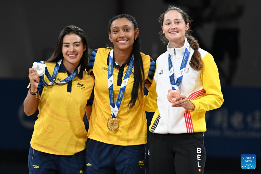 CHENGDU, 15 agosto, 2025 (Xinhua) -- La medallista de oro María Fernanda Timms Ariza (c), la medallista de plata Gabriela Rueda, de Colombia, y la medallista de bronce Fran Vanhoutte, de Bélgica, posan durante la ceremonia de premiación de esprint femenino 1000 m de patinaje de velocidad en línea en pista en los Juegos Mundiales 2025, en Chengdu, en la provincia de Sichuan, en el suroeste de China, el 15 de agosto de 2025. (Xinhua/Xie Jianfei)