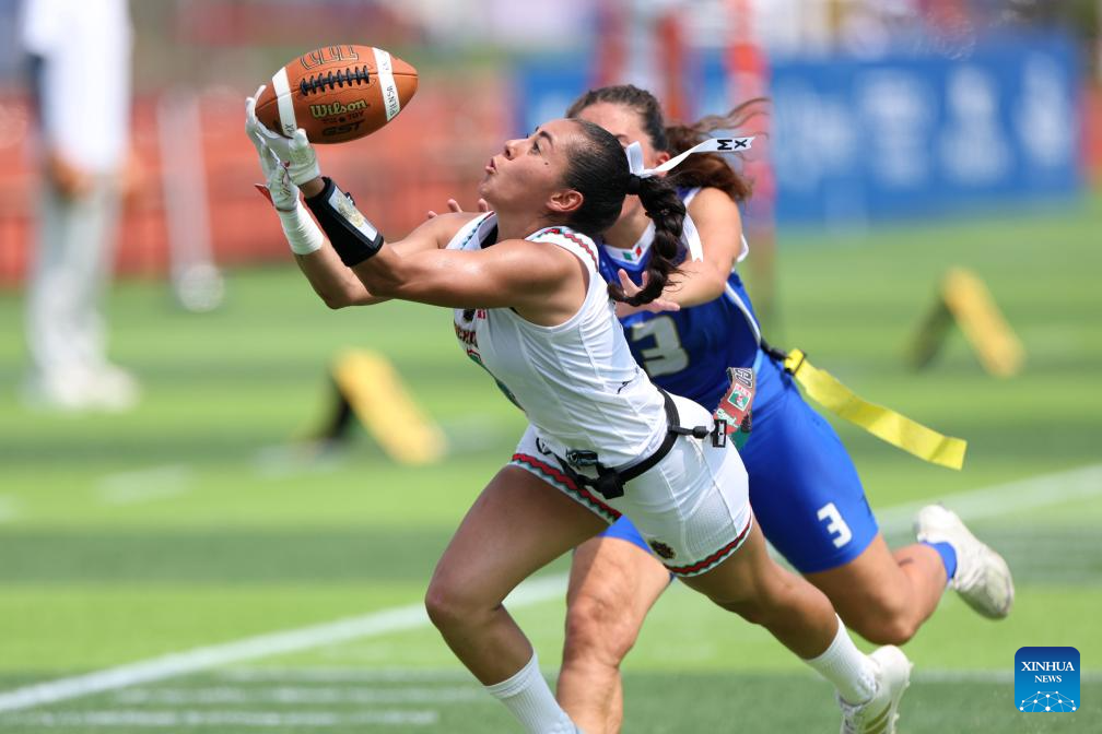 CHENGDU, 15 agosto, 2025 (Xinhua) -- Mónica Rangel (frente), de México, atrapa el balón durante el partido del grupo B de la ronda preliminar femenina de fútbol bandera entre México e Italia, en los Juegos Mundiales 2025, en Chengdu, en la provincia de Sichuan, en el suroeste de China, el 15 de agosto de 2025. (Xinhua/Chen Bin)