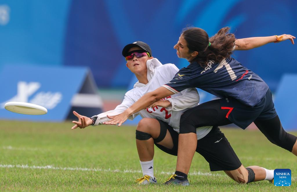 CHENGDU, 15 agosto, 2025 (Xinhua) -- Wei Simei (i), de China, compite ante Laura Ospina, de Colombia, durante el encuentro de semifinal de consolación mixta 5-8 de disco volador entre China y Colombia en los Juegos Mundiales 2025, en Chengdu, en la provincia de Sichuan, en el suroeste de China, el 15 de agosto de 2025. (Xinhua/Sun Fanyue)