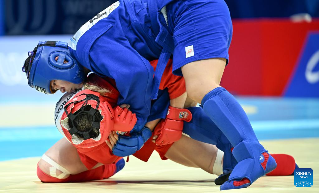 CHENGDU, 15 agosto, 2025 (Xinhua) -- Imagen del 14 de agosto de 2025 de Aislinn Agnes Yap (arriba), de Filipinas, compitiendo ante Nicole Castro, de Costa Rica, durante el combate por la medalla de bronce de las finales de sambo femenino -80 kg en los Juegos Mundiales 2025, en Chengdu, en la provincia de Sichuan, en el suroeste de China. (Xinhua/Bei He)