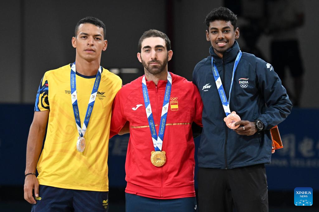 CHENGDU, 15 agosto, 2025 (Xinhua) -- El medallista de oro Jhoan Sebastián Guzmán Bitar (c), de España, el medallista de plata Jhon Edwar Tascón Holguín (i), de Colombia, y el medallista de bronce Anandkumar Velkumar, de India, posan durante la ceremonia de premiación de esprint masculino 1000 m de patinaje de velocidad en línea en pista en los Juegos Mundiales 2025, en Chengdu, en la provincia de Sichuan, en el suroeste de China, el 15 de agosto de 2025. (Xinhua/Xie Jianfei)