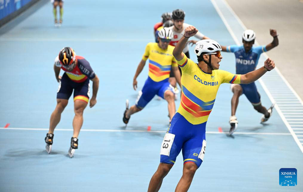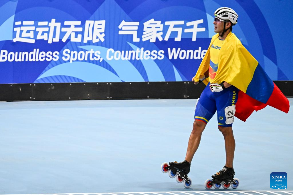 CHENGDU, 15 agosto, 2025 (Xinhua) -- Juan Jacobo Mantilla Pinilla, de Colombia, festeja después de ganar la final de la carrera de eliminación masculina de 10000 m de patinaje de velocidad en línea en pista en los Juegos Mundiales 2025, en Chengdu, en la provincia de Sichuan, en el suroeste de China, el 15 de agosto de 2025. (Xinhua/Xie Jianfei)