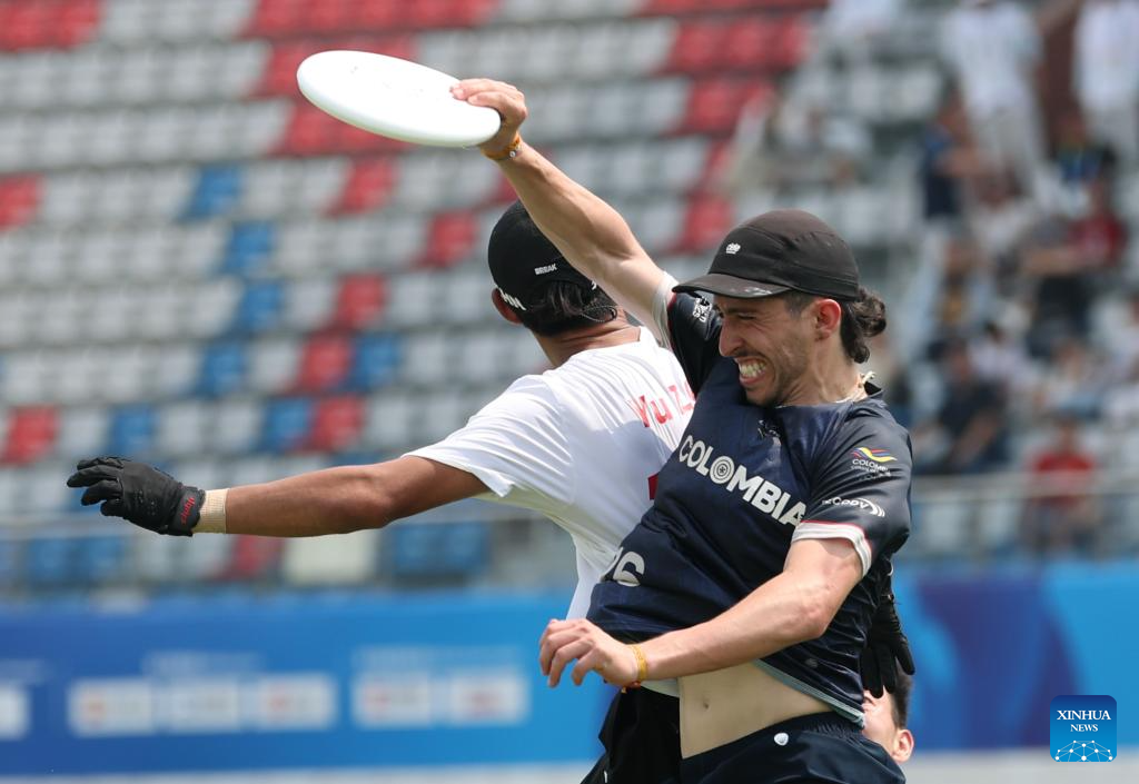 CHENGDU, 15 agosto, 2025 (Xinhua) -- Simón Ramírez Ortiz (d), de Colombia, anota durante el encuentro de semifinal de consolación mixta 5-8 de disco volador entre China y Colombia en los Juegos Mundiales 2025, en Chengdu, en la provincia de Sichuan, en el suroeste de China, el 15 de agosto de 2025. (Xinhua/Sun Fanyue)