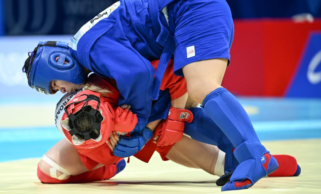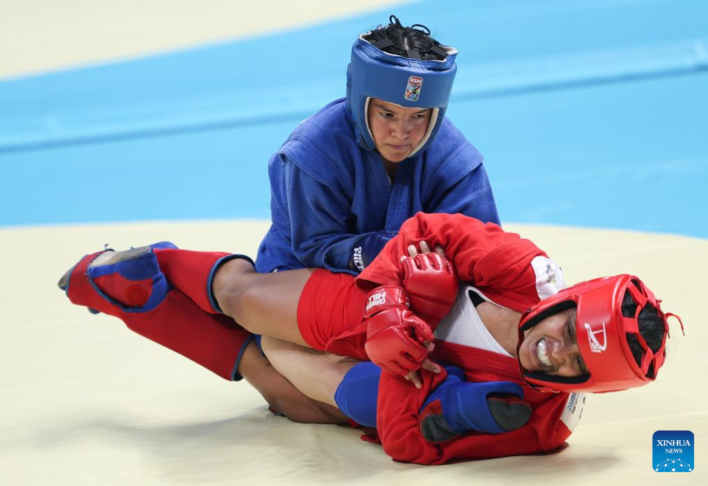 CHENGDU, 15 agosto, 2025 (Xinhua) -- Imagen del 14 de agosto de 2025 de Gulsevar Urakova (arriba), de Uzbekistán, compitiendo ante Luisaigna Campos, de Venezuela, durante el combate por la medalla de oro de las finales de sambo femenino -54kg en los Juegos Mundiales 2025, en Chengdu, en la provincia de Sichuan, en el suroeste de China. (Xinhua/Jiang Hongjing)