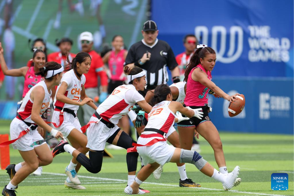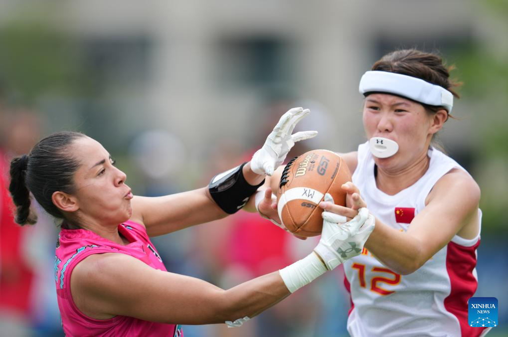 CHENGDU, 16 agosto, 2025 (Xinhua) -- Xu Zihan (d), de China, compite con Mónica Rangel, de México, durante el partido de cuartos de final femenino de fútbol bandera entre México y China, en los Juegos Mundiales 2025, en Chengdu, en la provincia de Sichuan, en el suroeste de China, el 16 de agosto de 2025. (Xinhua/Jiang Hongjing)