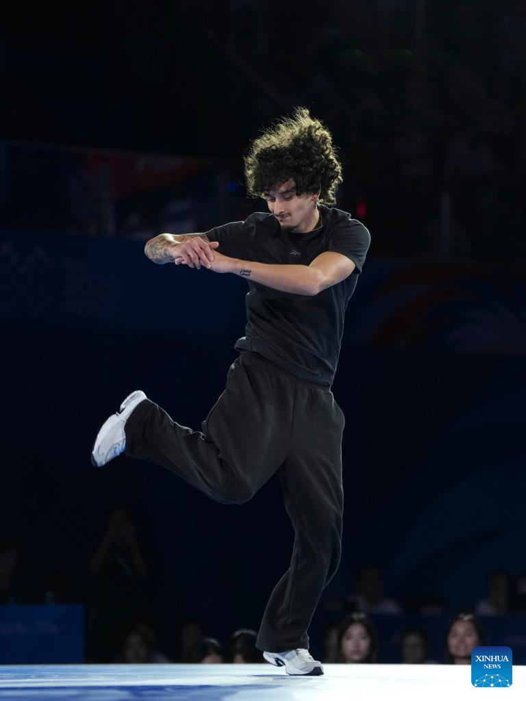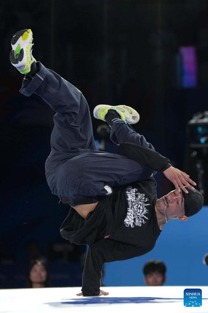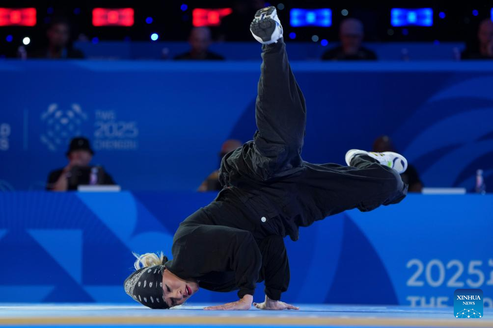 CHENGDU, 16 agosto, 2025 (Xinhua) -- Matita, de Chile, realiza una presentación durante la batalla de round robin (todos contra todos) de B-Boys de Breaking, en los Juegos Mundiales 2025 en Chengdu, en la provincia de Sichuan, en el suroeste de China, el 16 de agosto de 2025. (Xinhua/Xu Bingjie)