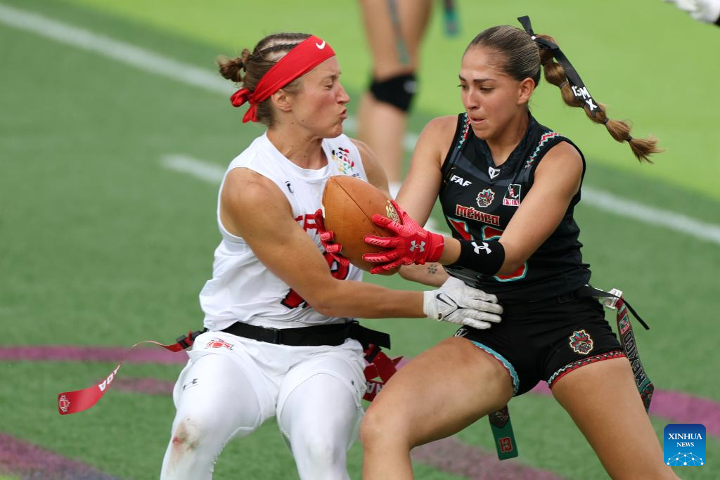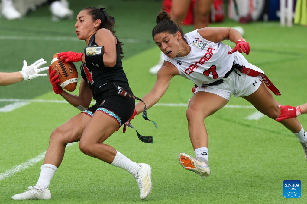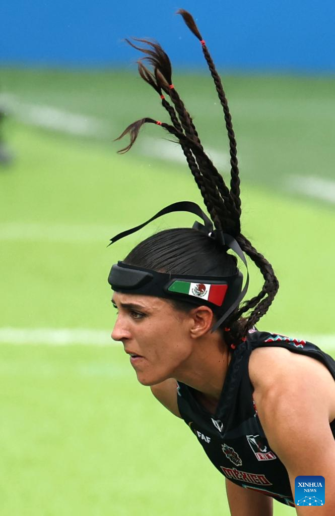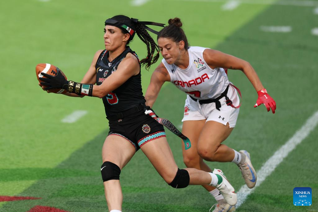 CHENGDU, 16 agosto, 2025 (Xinhua) -- Silvia Contreras (i), de México, compite durante el partido de semifinal femenina de fútbol bandera entre México y Canadá, en los Juegos Mundiales 2025, en Chengdu, en la provincia de Sichuan, en el suroeste de China, el 16 de agosto de 2025. (Xinhua/Chen Bin)