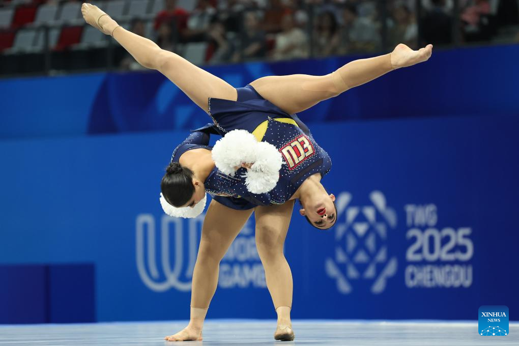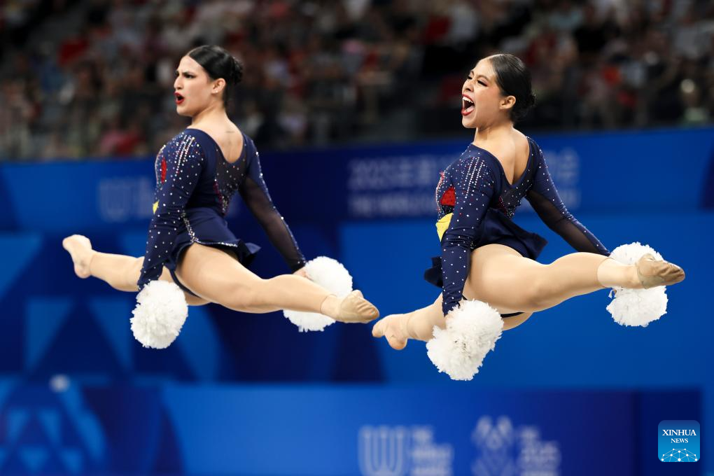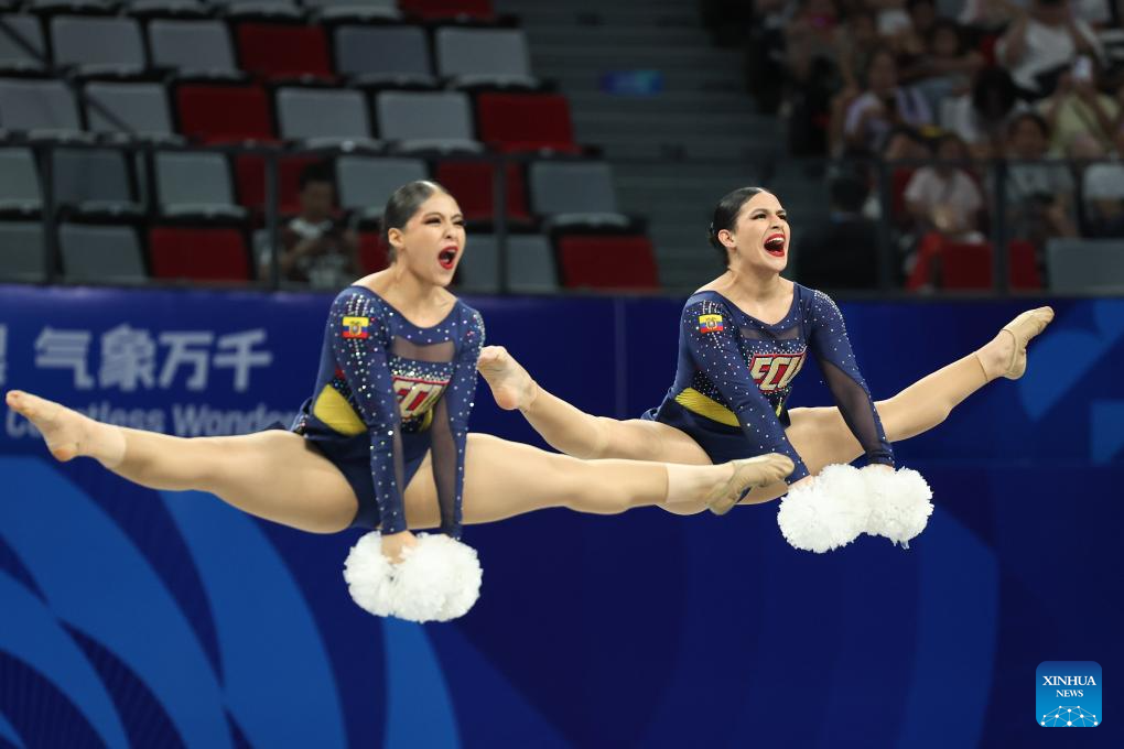 CHENGDU, 16 agosto, 2025 (Xinhua) -- Jennifer García/Fabiana Vélez, de Ecuador, realizan una presentación durante la ronda 2 de semifinales de animación deportiva con pompones dobles, en los Juegos Mundiales 2025, en Chengdu, en la provincia de Sichuan, en el suroeste de China, el 16 de agosto de 2025. (Xinhua/Liang Xu)
