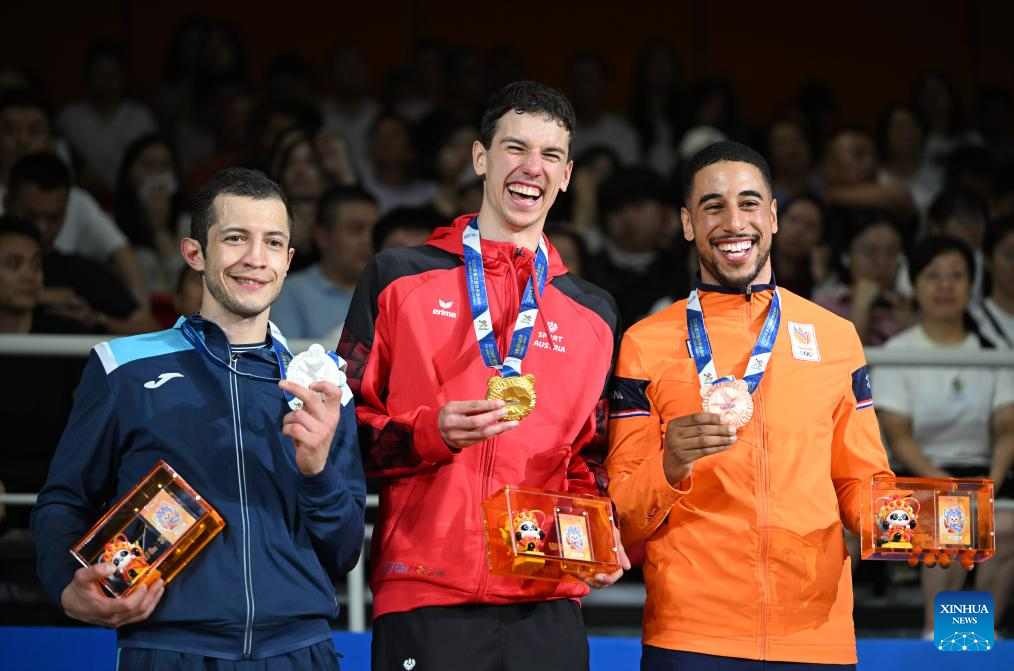 CHENGDU, 16 agosto, 2025 (Xinhua) -- Imagen del 14 de agosto de 2025 del medallista de oro, Erik Zimmermann (c), de Austria, el medallista de plata, José Santiago Bendfeldt (i), de Guatemala, y el medallista de bronce, Carvin Guiliano Burke, de Países Bajos, posando durante la ceremonia de premiación de la final de combate masculino por puntos de -74 kg de kickboxing, en los Juegos Mundiales 2025, en Chengdu, en la provincia de Sichuan, en el suroeste de China. (Xinhua/Zhang Bowen)