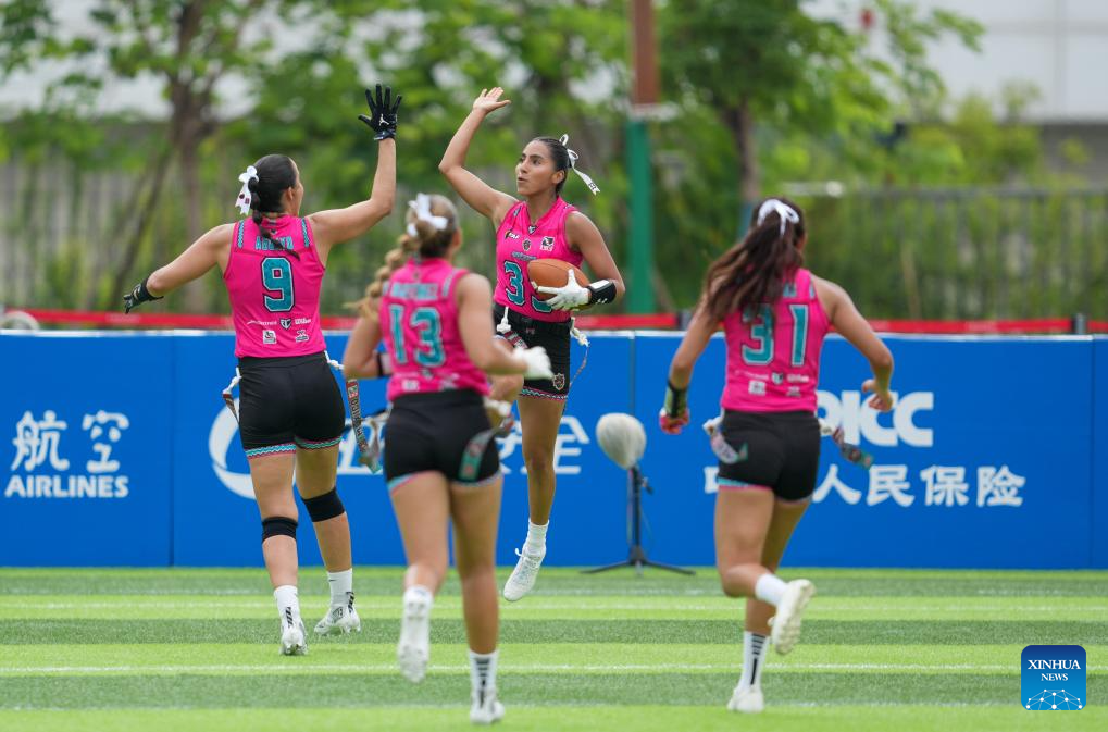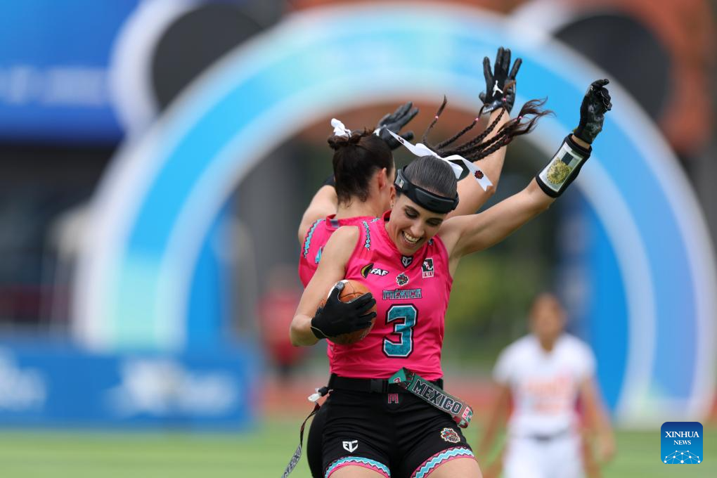 CHENGDU, 16 agosto, 2025 (Xinhua) -- Silvia Contreras (d), de México, festeja después de realizar una anotación durante el partido de cuartos de final femenino de fútbol bandera entre México y China, en los Juegos Mundiales 2025, en Chengdu, en la provincia de Sichuan, en el suroeste de China, el 16 de agosto de 2025. (Xinhua/Chen Bin)