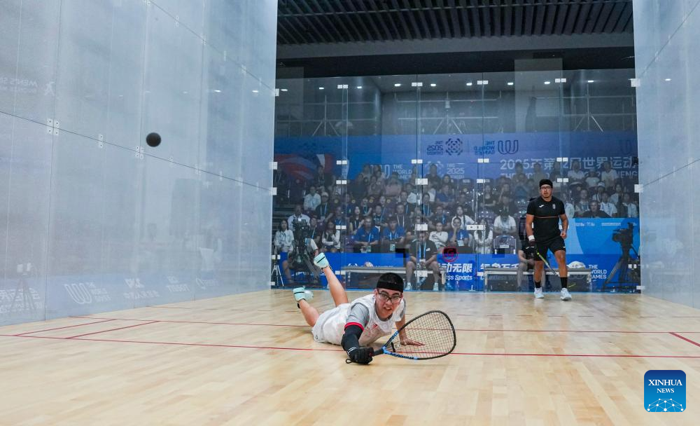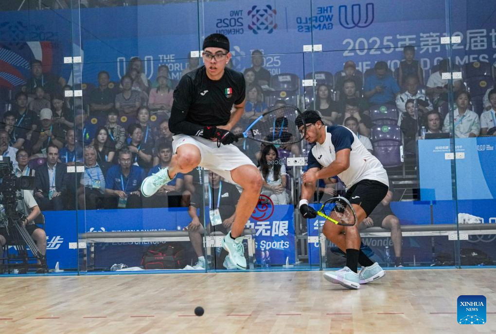 CHENGDU, 16 agosto, 2025 (Xinhua) -- Eduardo Portillo Torres (i) compite durante el partido por la medalla de bronce de individuales masculinos de ráquetbol entre Eduardo Portillo Torres, de México, y Edwin Aroldo Galicia Lutín, de Guatemala, en los Juegos Mundiales 2025, en Chengdu, en la provincia de Sichuan, en el suroeste de China, el 16 de agosto de 2025. (Xinhua/Tenzin Nyida)