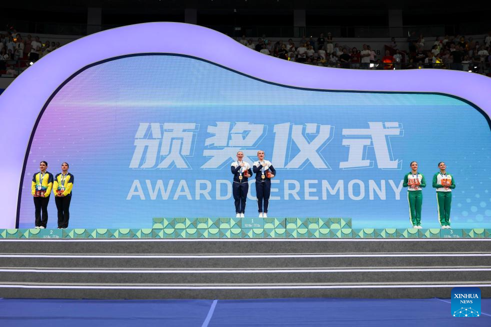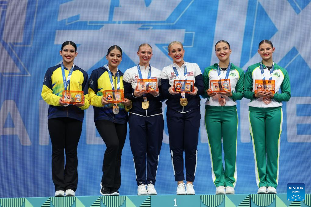 CHENGDU, 16 agosto, 2025 (Xinhua) -- (De izq. a der.) Las medallistas de plata, Jennifer García/Fabiana Vélez, de Ecuador, las medallistas de oro, Sydney Martin/Allison Hoeft, de Estados Unidos, y las medallistas de bronce, Shayla Myerscough/Emily Growdon, de Australia, son vistas durante la ceremonia de premiación de la final de animación deportiva con pompones dobles, en los Juegos Mundiales 2025, en Chengdu, en la provincia de Sichuan, en el suroeste de China, el 16 de agosto de 2025. (Xinhua/Wang Xiang)