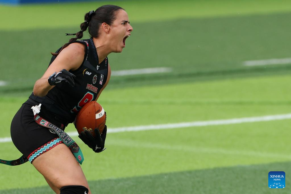 CHENGDU, 16 agosto, 2025 (Xinhua) -- Ana Aguayo, de México, festeja después de realizar una anotación durante el partido de semifinal femenina de fútbol bandera entre México y Canadá, en los Juegos Mundiales 2025, en Chengdu, en la provincia de Sichuan, en el suroeste de China, el 16 de agosto de 2025. (Xinhua/Chen Bin)