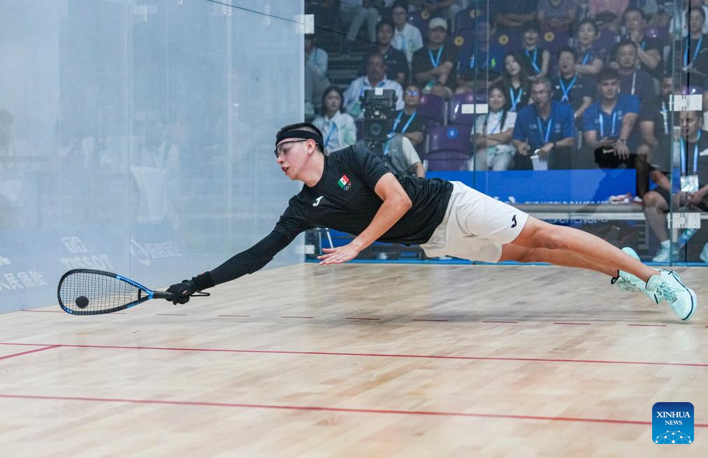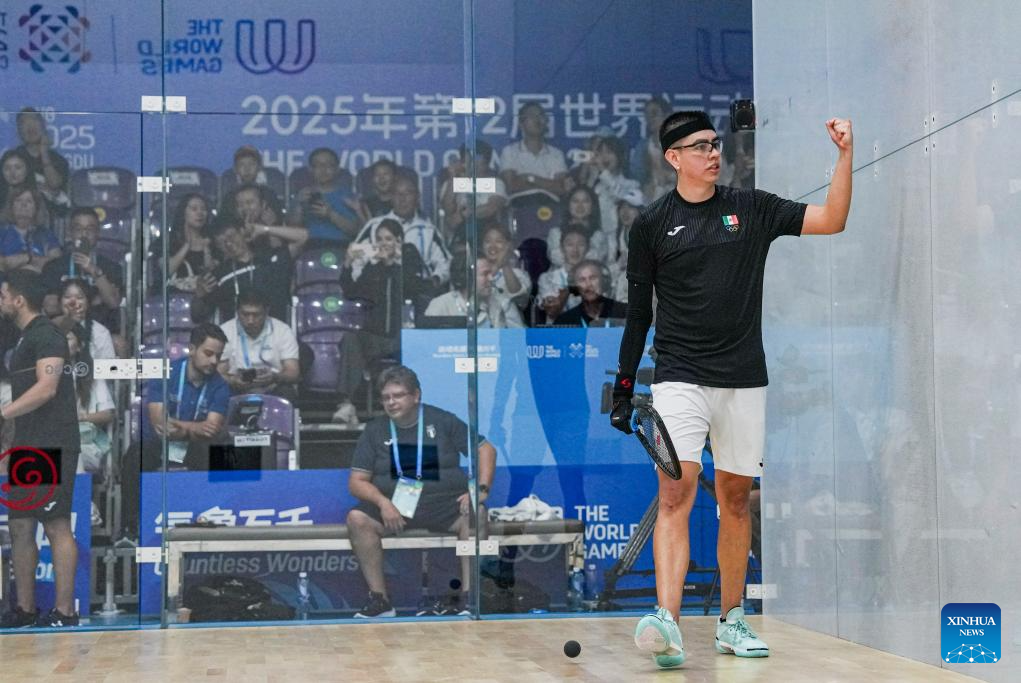 CHENGDU, 16 agosto, 2025 (Xinhua) -- Eduardo Portillo Torres compite durante el partido por la medalla de bronce de individuales masculinos de ráquetbol entre Eduardo Portillo Torres, de México, y Edwin Aroldo Galicia Lutín, de Guatemala, en los Juegos Mundiales 2025, en Chengdu, en la provincia de Sichuan, en el suroeste de China, el 16 de agosto de 2025. (Xinhua/Tenzin Nyida)