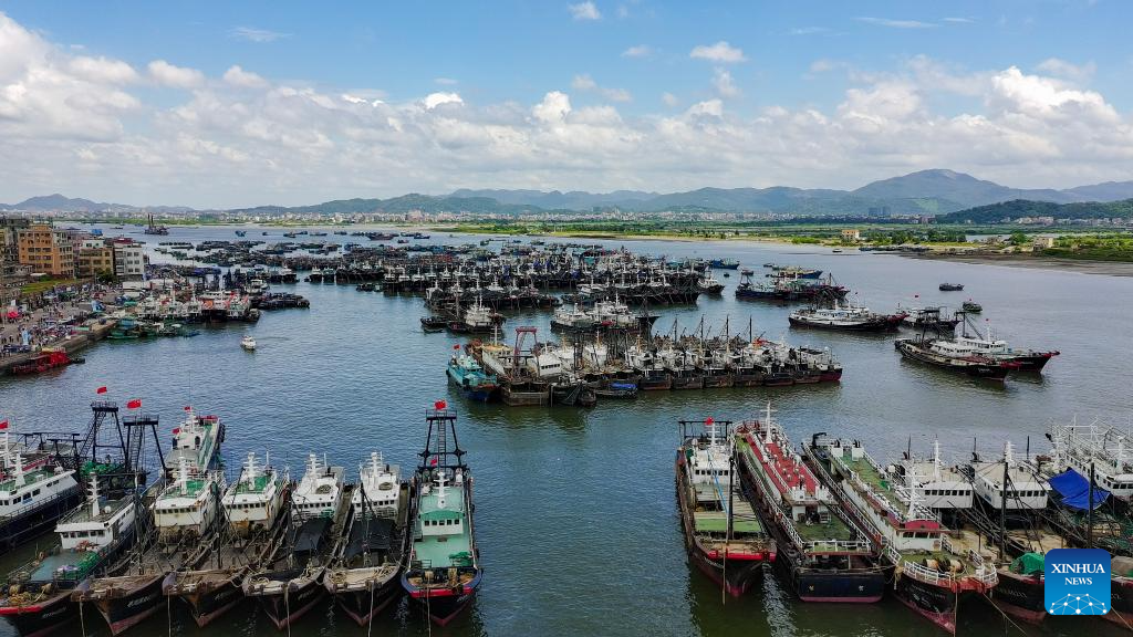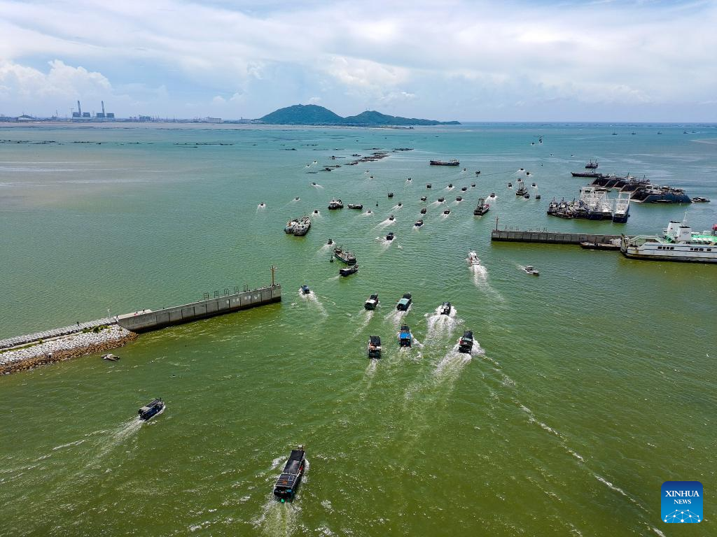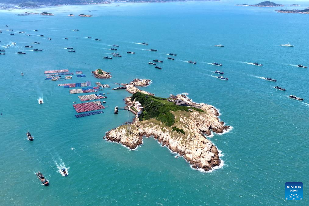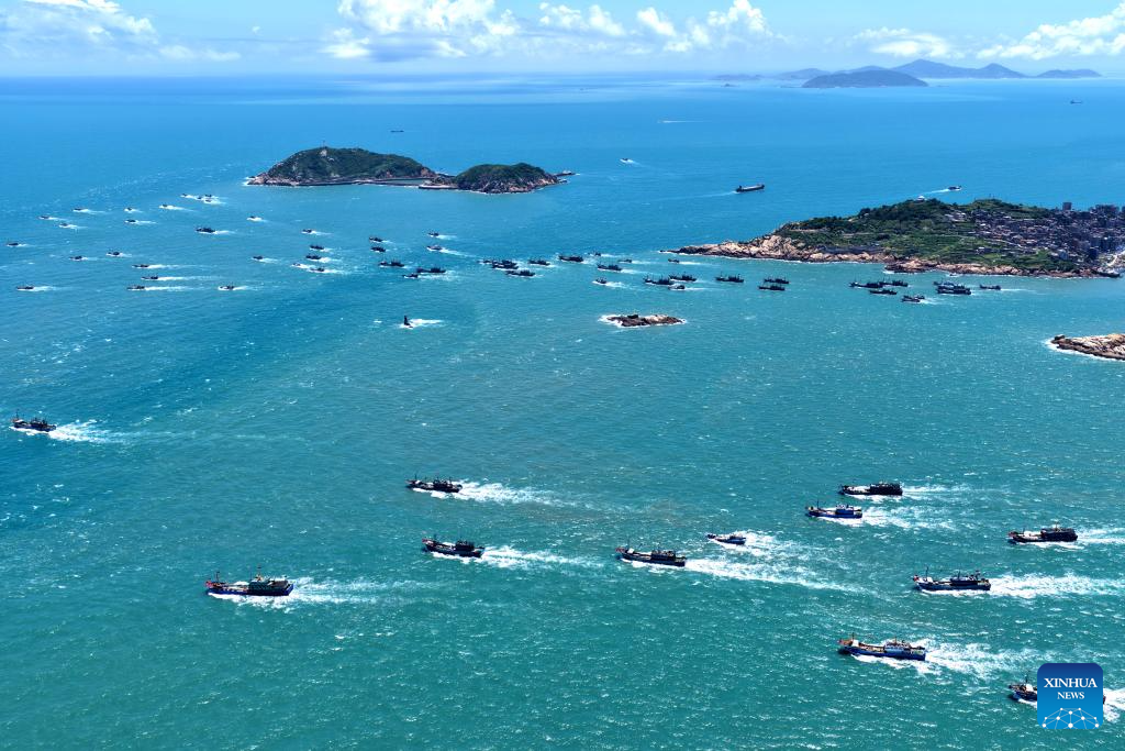 FUZHOU, 16 agosto, 2025 (Xinhua) -- Vista aérea tomada con un dron el 16 de agosto de 2025 de botes pesqueros zarpando de un puerto pesquero tras el fin de la prohibición de pesca estacional, en el distrito de Lianjiang de Fuzhou, en la provincia de Fujian, en el sureste de China. (Xinhua/Wang Wangwang)