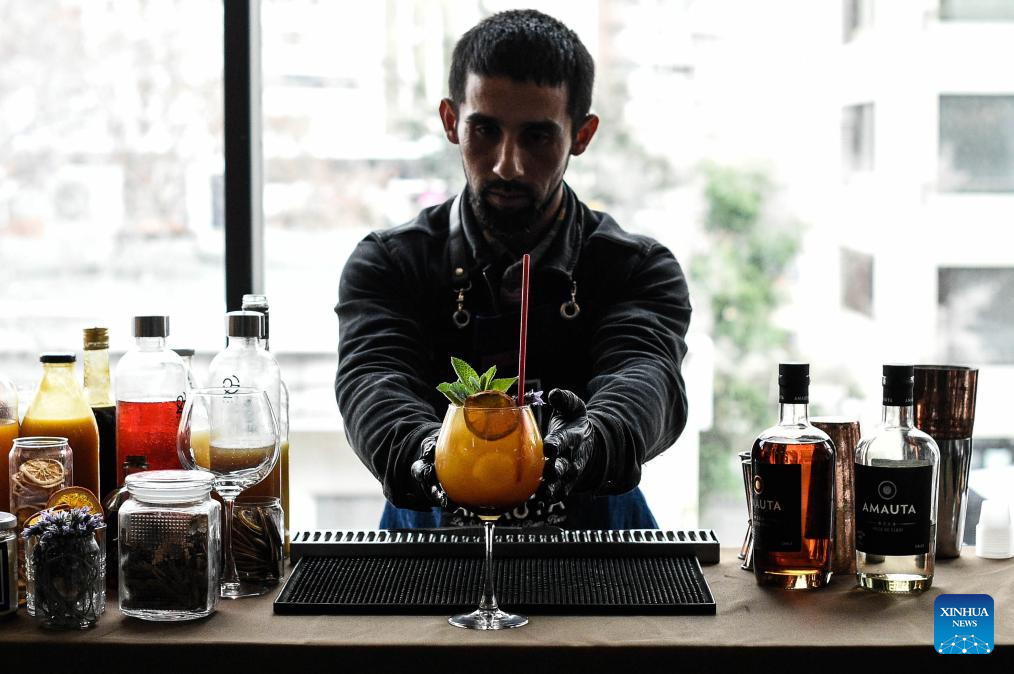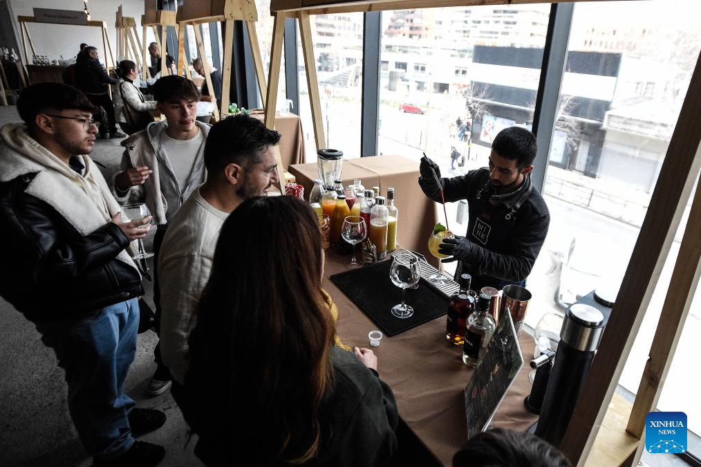 Imagen del 15 de agosto de 2025 de un expositor preparando un coctel a base de pisco durante el evento "Puro Pisco" llevado a cabo en el Mercado Urbano Tobalaba, en Santiago, capital de Chile. Más de 30 expositores de la industria del pisco chileno se reunieron en el evento "Puro Pisco", realizado del 14 al 16 de agosto en la capital Santiago, con la idea de incentivar el consumo de este destilado de uva producido en el norte de este país austral, cuya denominación de origen es una de las más antiguas del mundo. (Xinhua/Jorge Villegas)