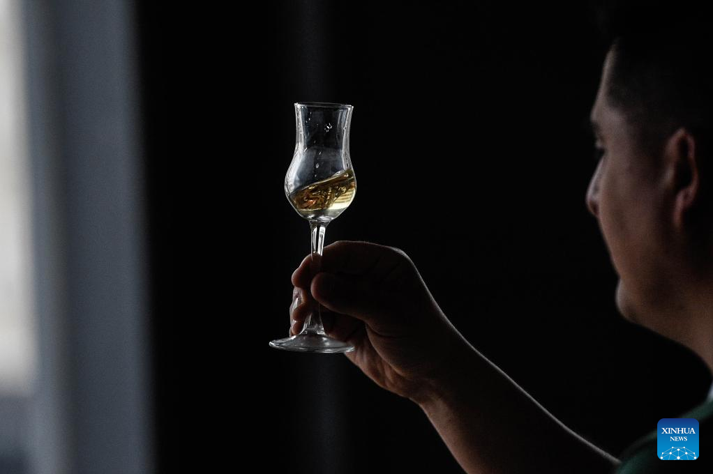 Imagen del 15 de agosto de 2025 de un hombre sosteniendo una copa de pisco durante el evento "Puro Pisco" llevado a cabo en el Mercado Urbano Tobalaba, en Santiago, capital de Chile. Más de 30 expositores de la industria del pisco chileno se reunieron en el evento "Puro Pisco", realizado del 14 al 16 de agosto en la capital Santiago, con la idea de incentivar el consumo de este destilado de uva producido en el norte de este país austral, cuya denominación de origen es una de las más antiguas del mundo. (Xinhua/Jorge Villegas)