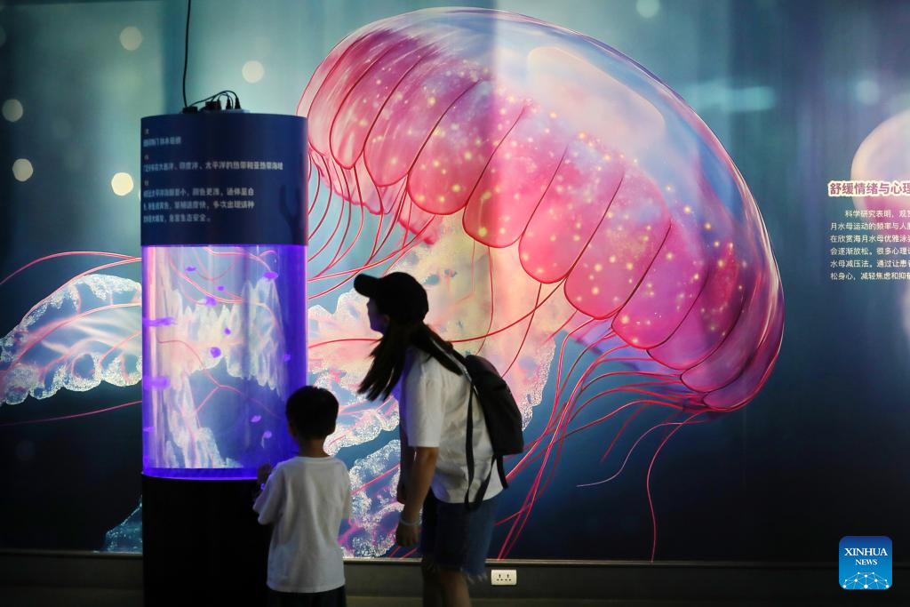 BEIJING, 16 agosto, 2025 (Xinhua) -- Un niño visita una exposición temática sobre las medusas en un museo, en la ciudad de Jiaxing, en la provincia de Zhejiang, en el este de China, el 16 de agosto de 2025. (Xinhua/Jin Peng)