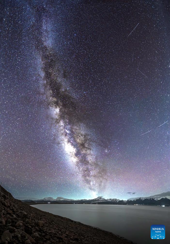 XIGAZE, 17 agosto, 2025 (Xinhua) -- Imagen del 14 de agosto de 2025 de la Vía Láctea y una lluvia de meteoritos sobre Baiku Co, en la ciudad de Xigaze, en la región autónoma de Xizang, en el suroeste de China. Baiku Co, con una superficie de agua de aproximadamente 300 kilómetros cuadrados, se encuentra a una altitud de 4.590 metros. Gracias a la excelente calidad del aire en la meseta, la Vía Láctea se puede ver claramente en el cielo estrellado a finales del verano y principios del otoño, creando un magnífico paisaje junto con el lago y las montañas nevadas. (Xinhua/Ma Lichao)