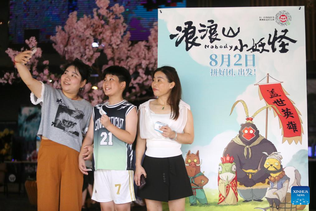 NANJING, 17 agosto, 2025 (Xinhua) -- Personas posan para fotografías frente a un cartel de película en un cine, en Yangzhou, en la provincia de Jiangsu, en el este de China, el 17 de agosto de 2025. El mercado cinematográfico ha experimentado un gran auge este fin de semana mientras varias películas de moda se estrenaron durante las vacaciones de verano. (Xinhua/Meng Delong)