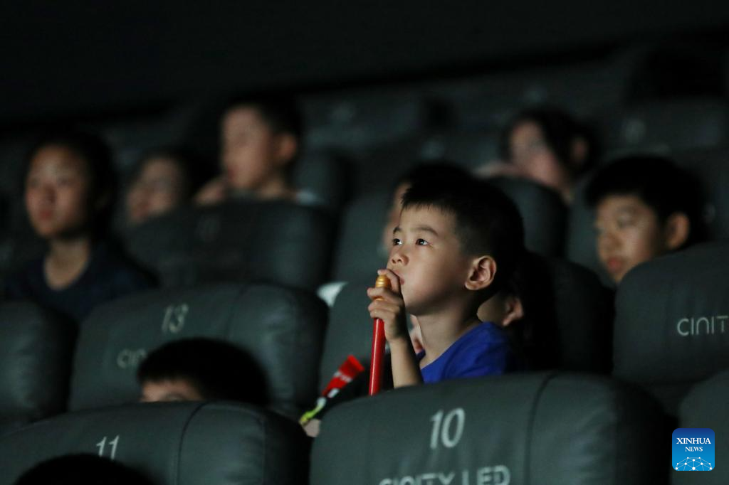 NANJING, 17 agosto, 2025 (Xinhua) -- Niños esperan para observar una película en un cine, en Jiaxing, en la provincia de Zhejiang, en el este de China, el 17 de agosto de 2025. El mercado cinematográfico ha experimentado un gran auge este fin de semana mientras varias películas de moda se estrenaron durante las vacaciones de verano. (Xinhua/Jin Peng)