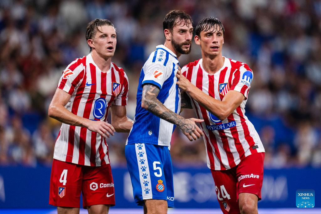 BARCELONA, 18 agosto, 2025 (Xinhua) -- Imagen del 17 de agosto de 2025 de Robin Le Normand (d), y Conor Gallagher (i), de Atlético de Madrid, compitiendo con Fernando Calero, de RCD Espanyol, durante el partido de fútbol de Laliga entre Atlético de Madrid y RCD Espanyol, en el estadio RCDE, en Barcelona, España. (Xinhua/Joan Gosa)
