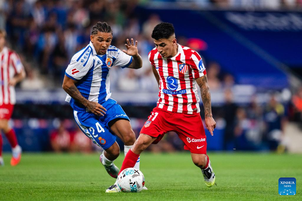 BARCELONA, 18 agosto, 2025 (Xinhua) -- Imagen del 17 de agosto de 2025 de Thiago Almada (d), de Atlético de Madrid, disputando el balón con Tyrhys Dolan, de RCD Espanyol, durante el partido de fútbol de Laliga entre Atlético de Madrid y RCD Espanyol, en el estadio RCDE, en Barcelona, España. (Xinhua/Joan Gosa)