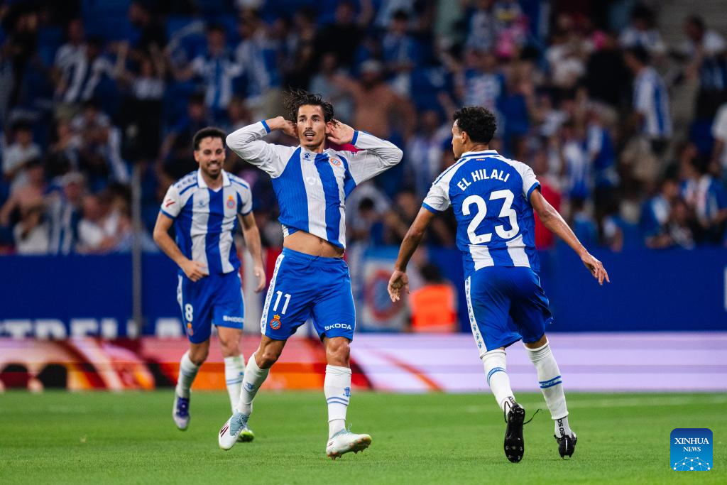 BARCELONA, 18 agosto, 2025 (Xinhua) -- Imagen del 17 de agosto de 2025 de Pere Milla (c), de RCD Espanyol, festejando su anotación durante el partido de fútbol de Laliga entre Atlético de Madrid y RCD Espanyol, en el estadio RCDE, en Barcelona, España. (Xinhua/Joan Gosa)