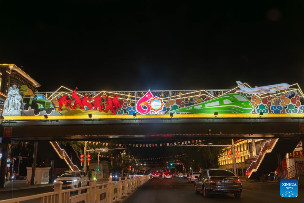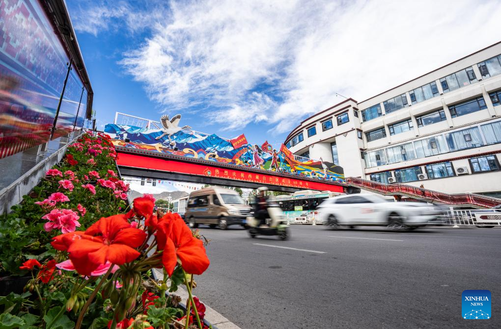 LHASA, 20 agosto, 2025 (Xinhua) -- Imagen del 19 de agosto de 2025 de una vista callejera, en Lhasa, en la región autónoma de Xizang, en el suroeste de China. Las calles de Lhasa se adornan con faroles y adornos para celebrar el 60 aniversario de la fundación de la región autónoma de Xizang. (Xinhua/Tenzin Nyida)