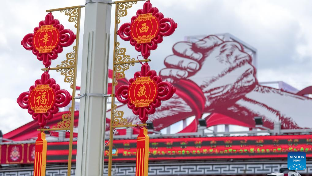 LHASA, 20 agosto, 2025 (Xinhua) -- Imagen del 19 de agosto de 2025 de decoraciones en una calle, en Lhasa, en la región autónoma de Xizang, en el suroeste de China. Las calles de Lhasa se adornan con faroles y adornos para celebrar el 60 aniversario de la fundación de la región autónoma de Xizang. (Xinhua/Jigme Dorje)