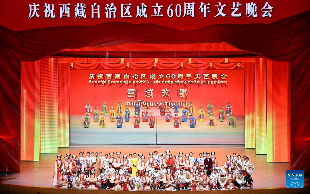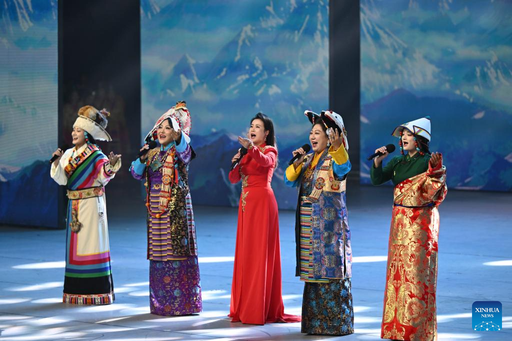 LHASA, 20 agosto, 2025 (Xinhua) -- Una gala titulada "Cantos alegres de la región de la meseta nevada" se lleva a cabo para conmemorar el 60º aniversario de la fundación de la región autónoma de Xizang, en la capital regional, Lhasa, el 20 de agosto de 2025. (Xinhua/Li Xiang)