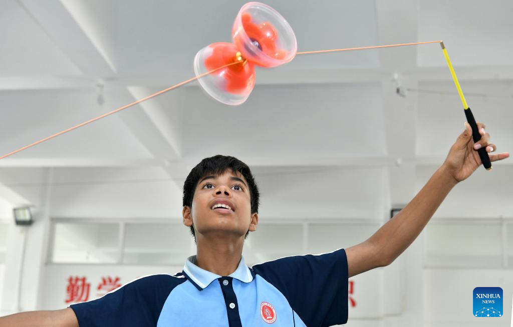 SHIJIAZHUANG, 20 agosto, 2025 (Xinhua) -- Un aprendiz (i) de Bangladesh practica en la Escuela de Arte Acrobático de Wuqiao de Hebei, en el distrito de Wuqiao, provincia de Hebei, en el norte de China, el 20 de agosto de 2025. Más de 20 aprendices de Bangladesh han estado entrenando intensamente en los últimos días en la Escuela de Arte Acrobático de Wuqiao de Hebei en el condado de Wuqiao, apodada la "cuna de la acrobacia china". (Xinhua/Mu Yu)