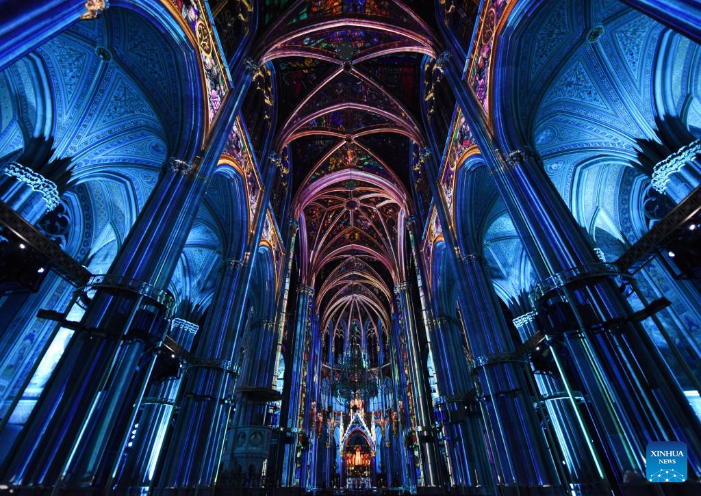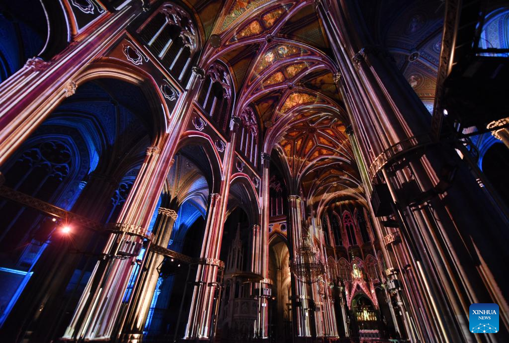 VIENA, 21 agosto, 2025 (Xinhua) -- Imagen del 20 de agosto de 2025 de una vista del espectáculo de luces "Luz de la Creación" en la Iglesia Votiva, en Viena, Austria. El espectáculo de luces que comenzó el 29 de noviembre de 2024, combina innovadores efectos de iluminación con música atmosférica y mística y crea una atmósfera etérea que atrae a todos los sentidos. (Xinhua/He Canling)