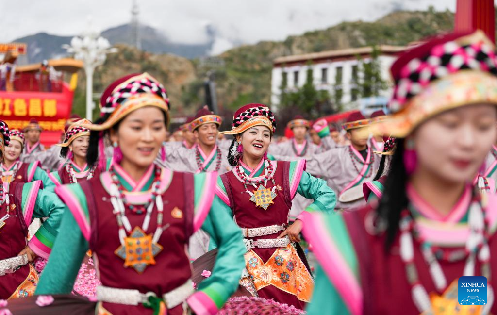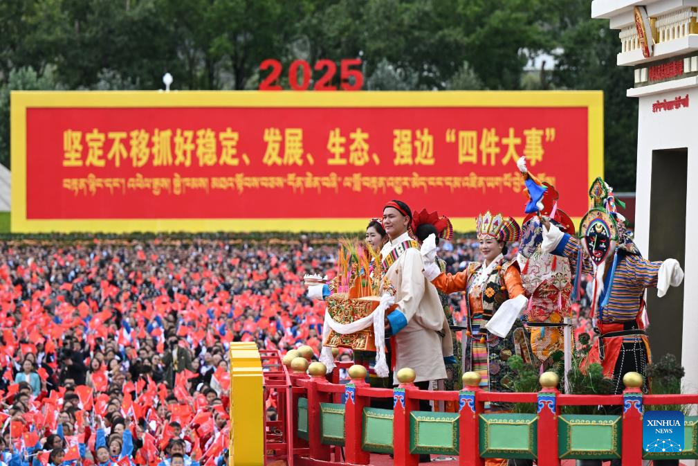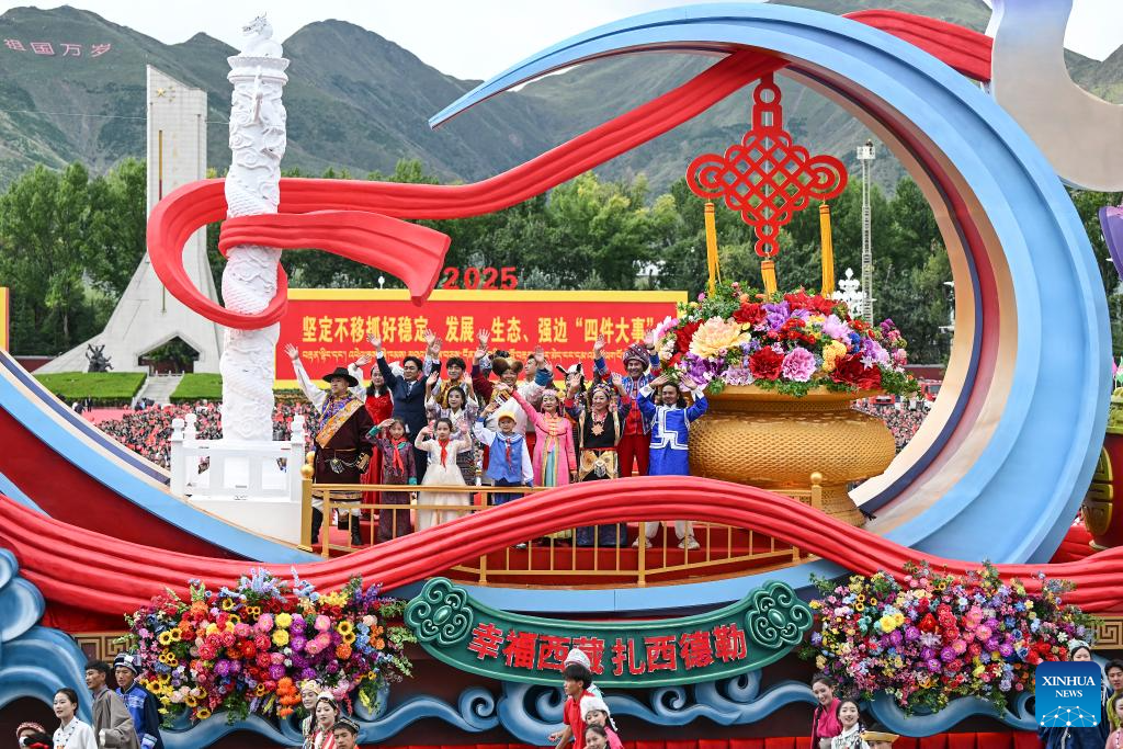 LHASA, 21 agosto, 2025 (Xinhua) -- Un carro alegórico participa en una gran reunión para conmemorar el 60º aniversario de la fundación de la región autónoma de Xizang, en Lhasa, en la región autónoma de Xizang, en el suroeste de China, el 21 de agosto de 2025. Unos 20.000 funcionarios locales y personas de todos los grupos étnicos y todos los ámbitos de la sociedad se unieron en la celebración. (Xinhua/Xie Huanchi)