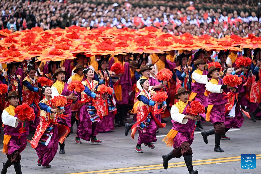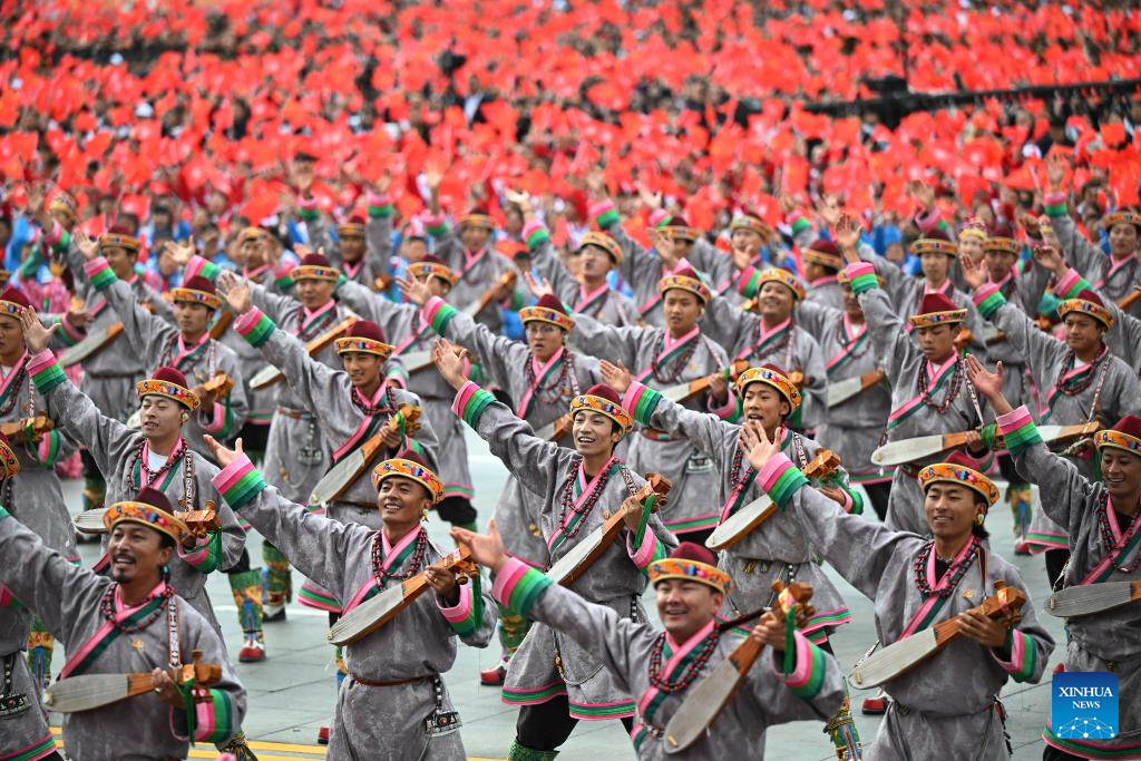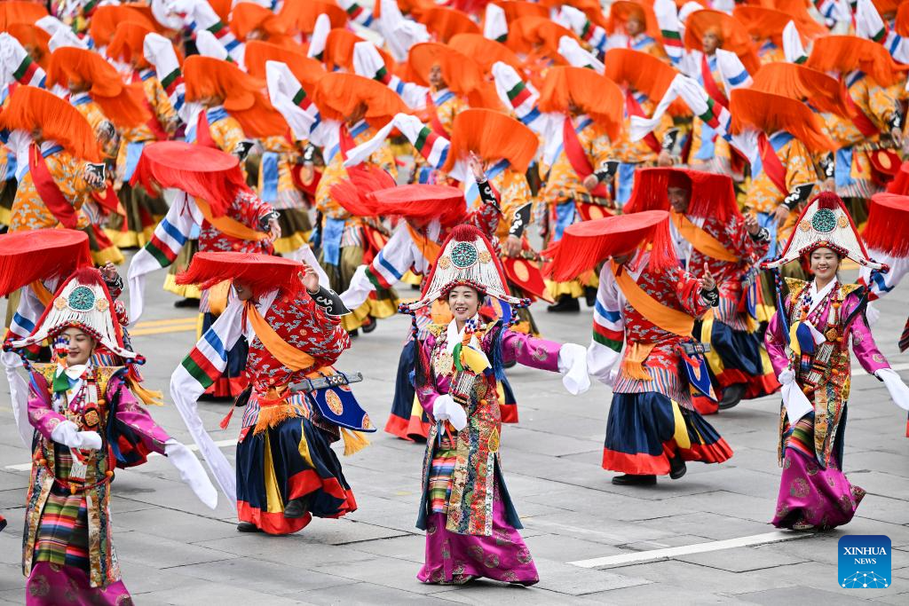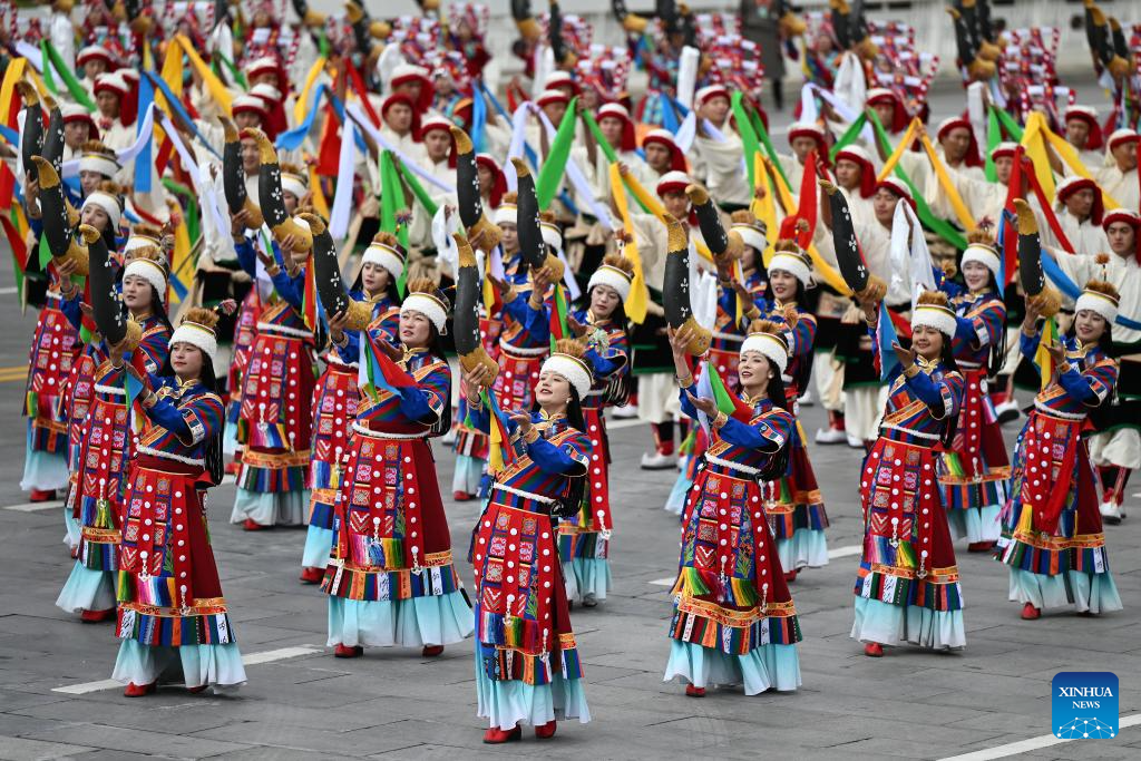 LHASA, 21 agosto, 2025 (Xinhua) -- Personas participan en un desfile masivo durante una gran reunión para conmemorar el 60º aniversario de la fundación de la región autónoma de Xizang, en Lhasa, en la región autónoma de Xizang, en el suroeste de China, el 21 de agosto de 2025. Unos 20.000 funcionarios locales y personas de todos los grupos étnicos y todos los ámbitos de la sociedad se unieron en la celebración. (Xinhua/Yan Yan)