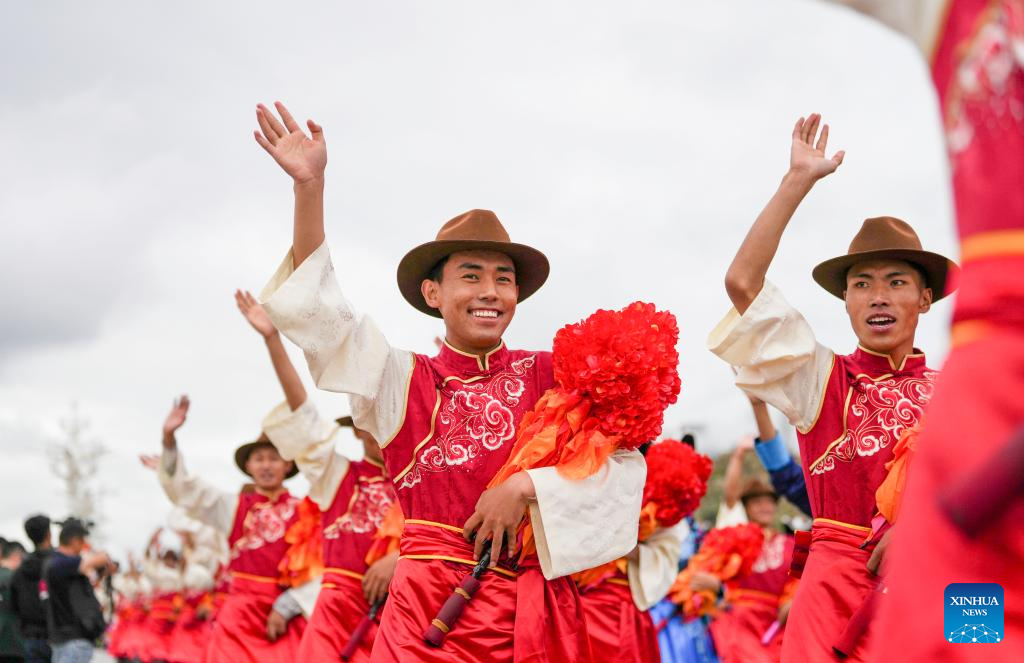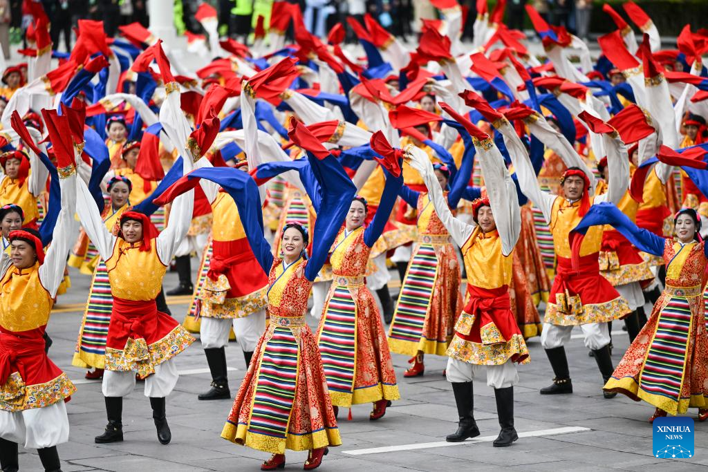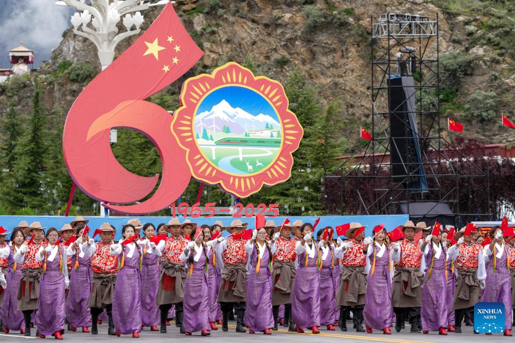 LHASA, 21 agosto, 2025 (Xinhua) -- Personas participan en un desfile masivo durante una gran reunión para conmemorar el 60º aniversario de la fundación de la región autónoma de Xizang, en Lhasa, en la región autónoma de Xizang, en el suroeste de China, el 21 de agosto de 2025. Unos 20.000 funcionarios locales y personas de todos los grupos étnicos y todos los ámbitos de la sociedad se unieron en la celebración. (Xinhua/Shen Hong)