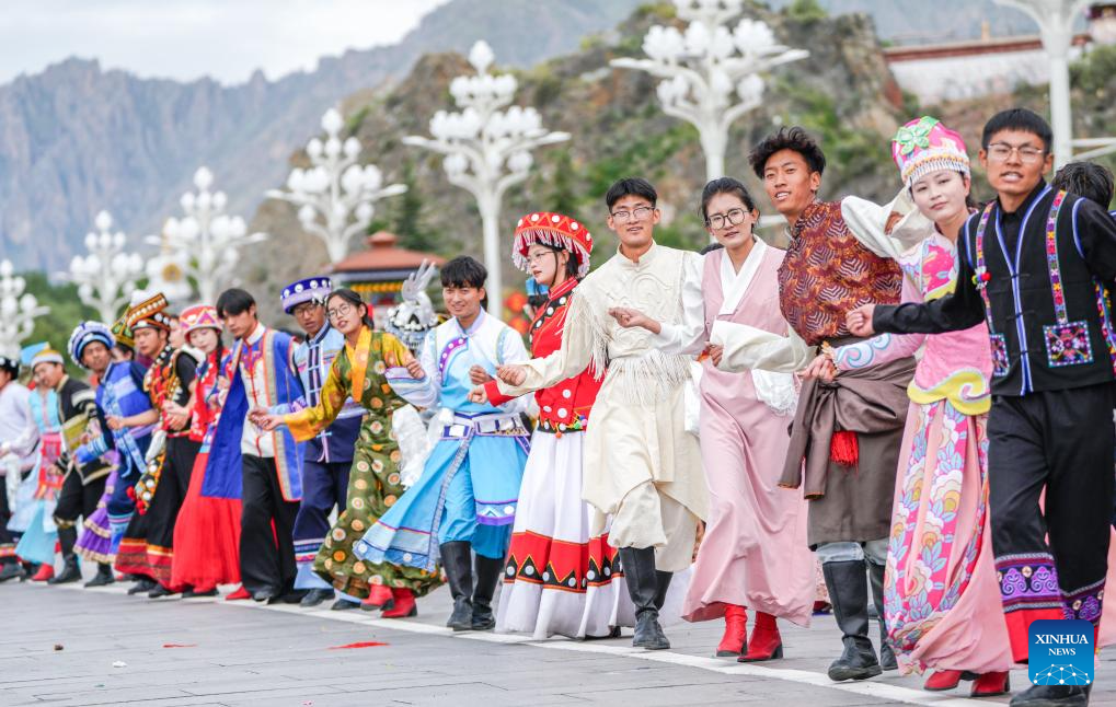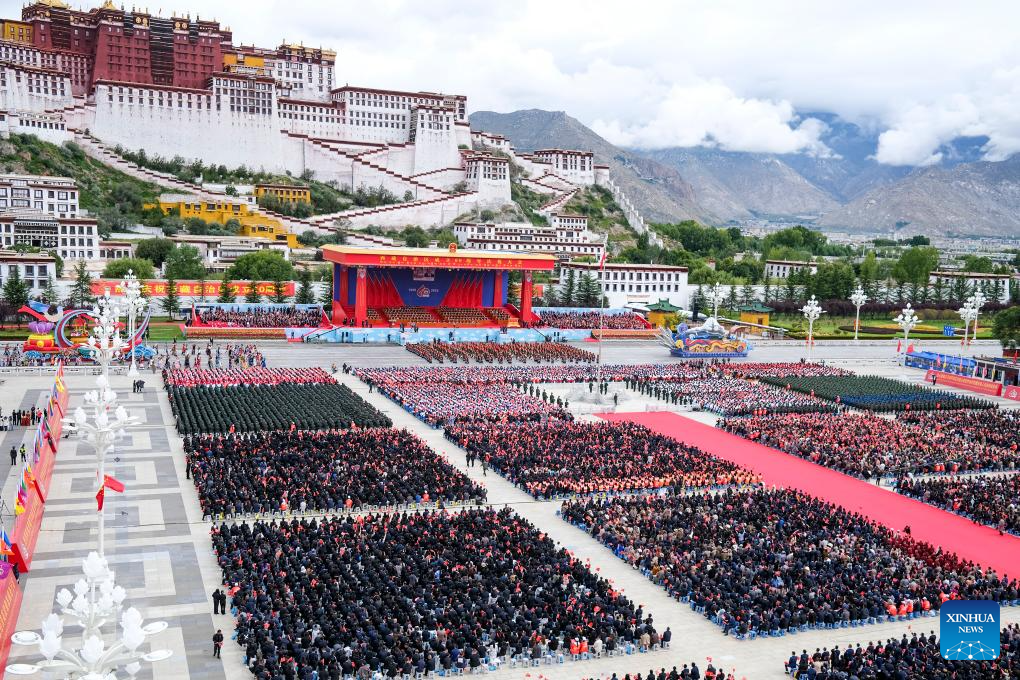 LHASA, 21 agosto, 2025 (Xinhua) -- Imagen del 21 de agosto de 2025 de una gran reunión para conmemorar el 60º aniversario de la fundación de la región autónoma de Xizang, en Lhasa, en la región autónoma de Xizang, en el suroeste de China. Unos 20.000 funcionarios locales y personas de todos los grupos étnicos y todos los ámbitos de la sociedad se unieron en la celebración. (Xinhua/Sonam Wangchug)