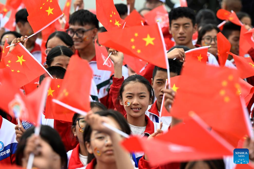 LHASA, 21 agosto, 2025 (Xinhua) -- Personas ondean banderas durante una gran reunión para conmemorar el 60º aniversario de la fundación de la región autónoma de Xizang, en Lhasa, en la región autónoma de Xizang, en el suroeste de China, el 21 de agosto de 2025. Unos 20.000 funcionarios locales y personas de todos los grupos étnicos y todos los ámbitos de la sociedad se unieron en la celebración. (Xinhua/Shen Hong)